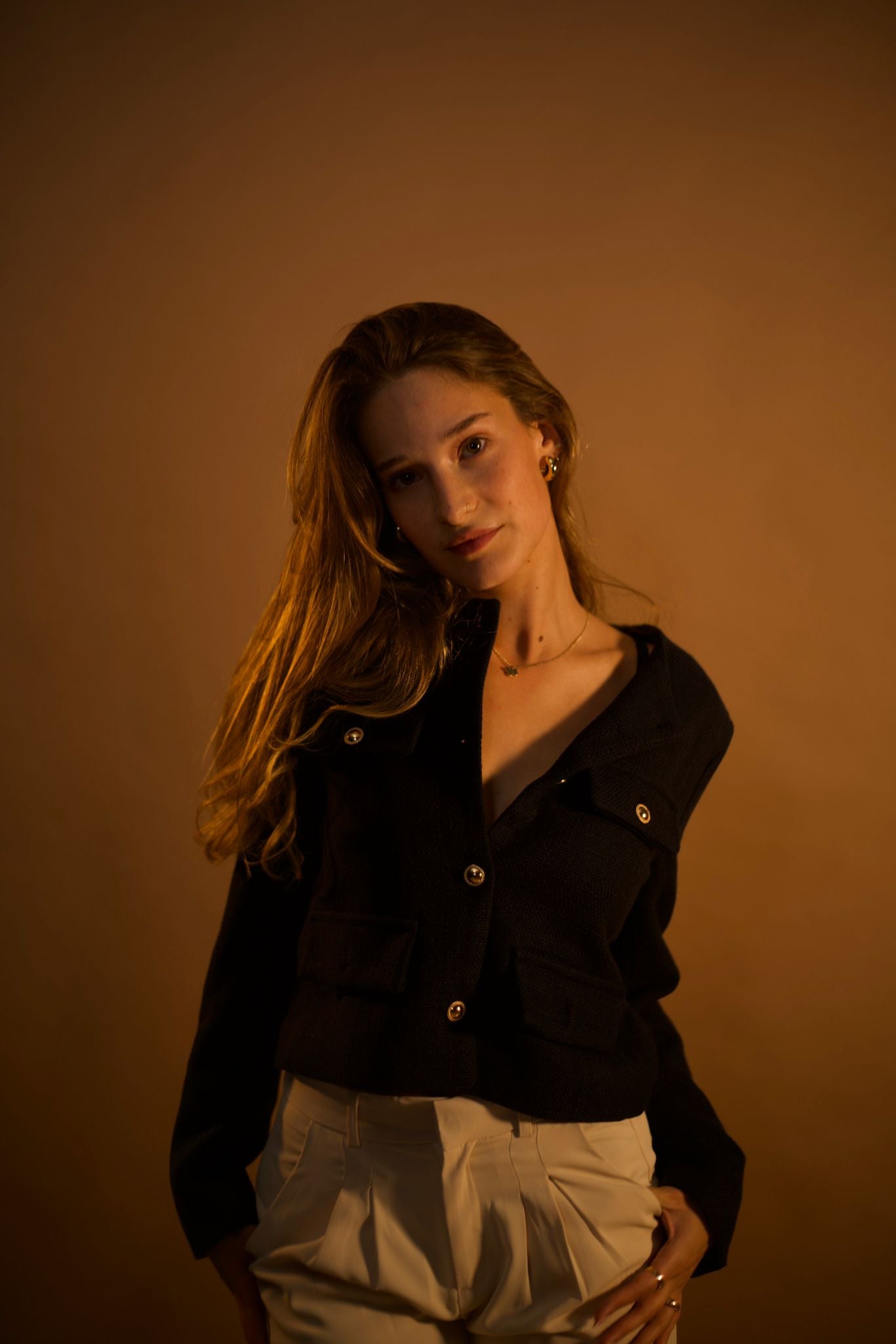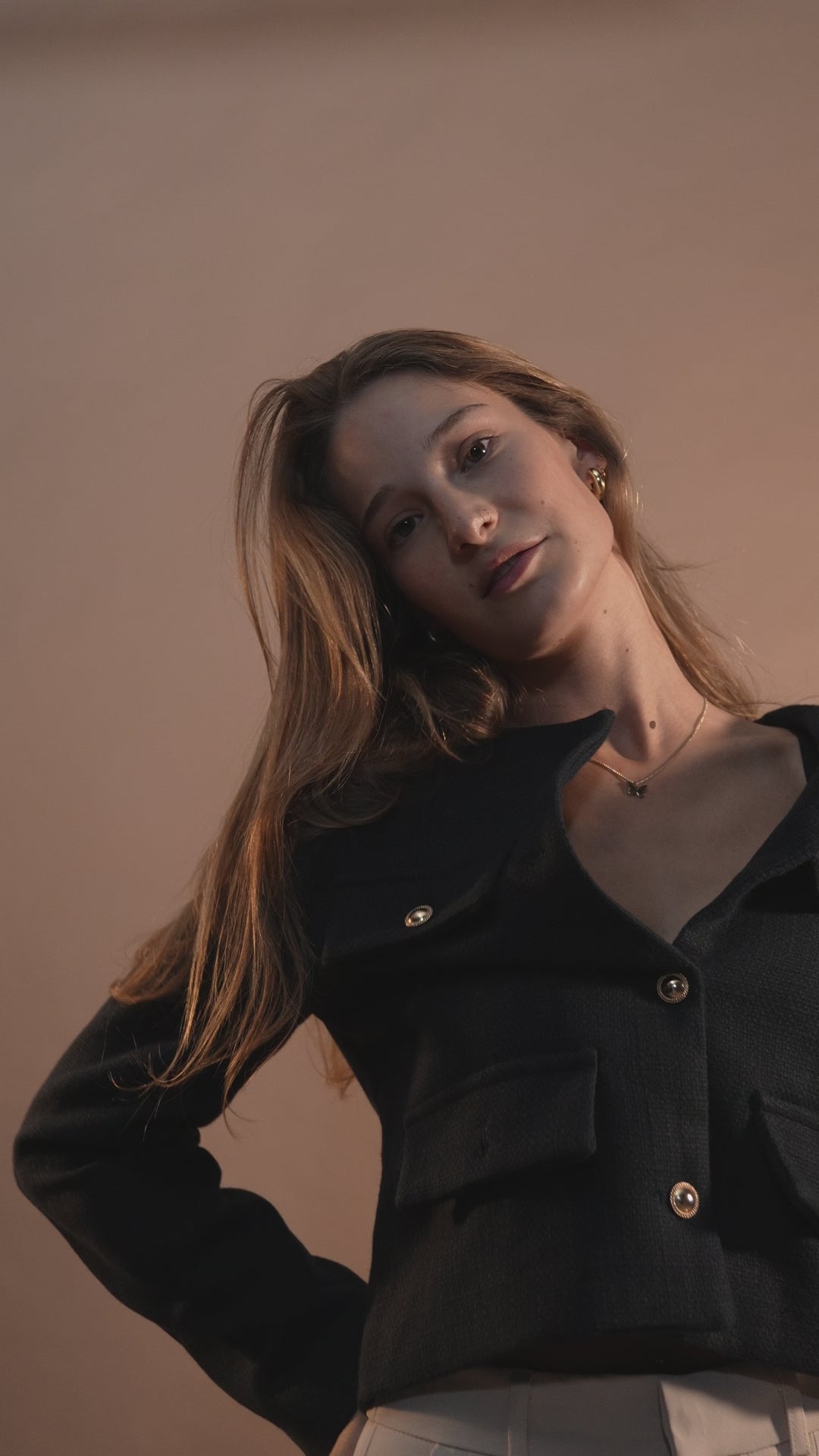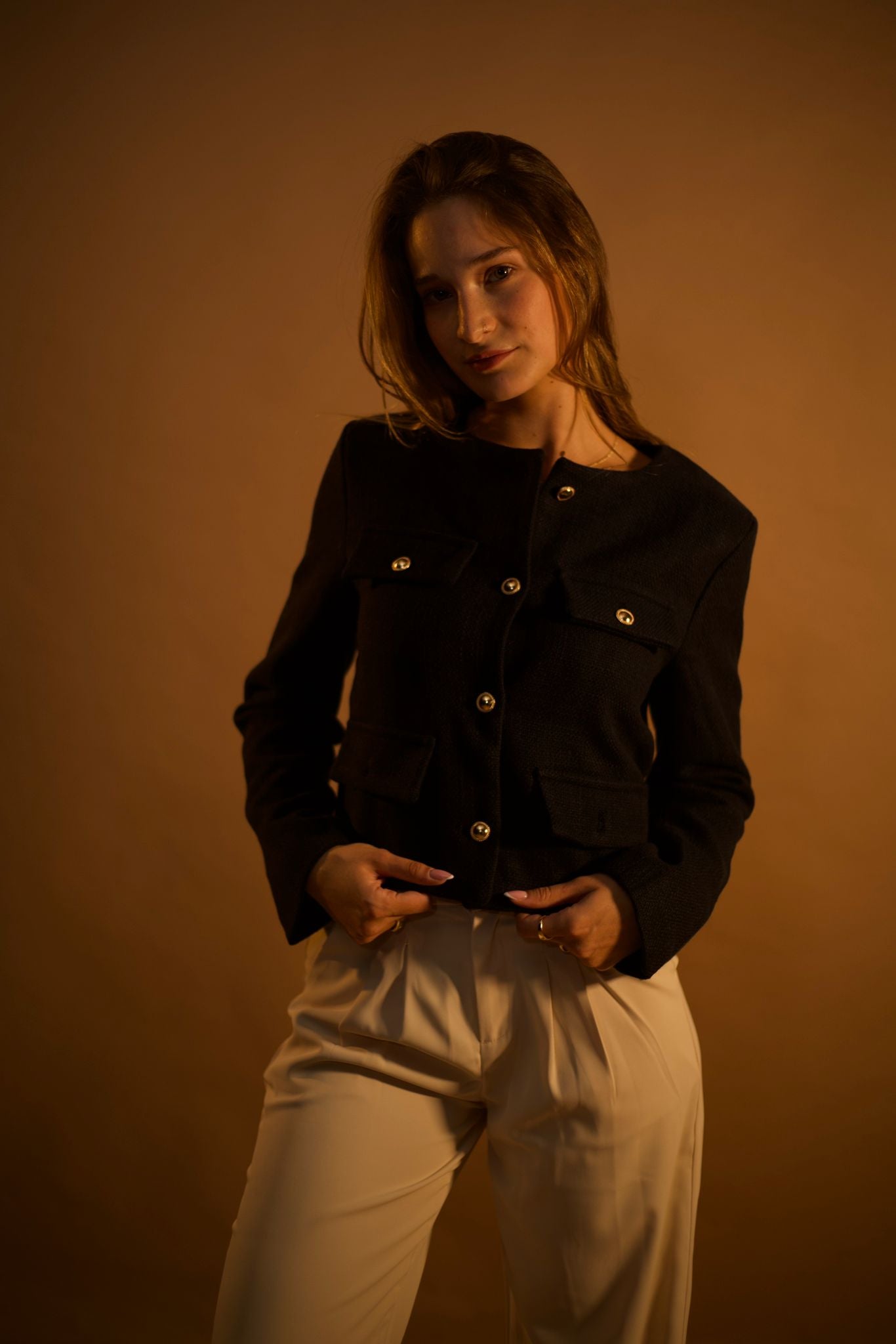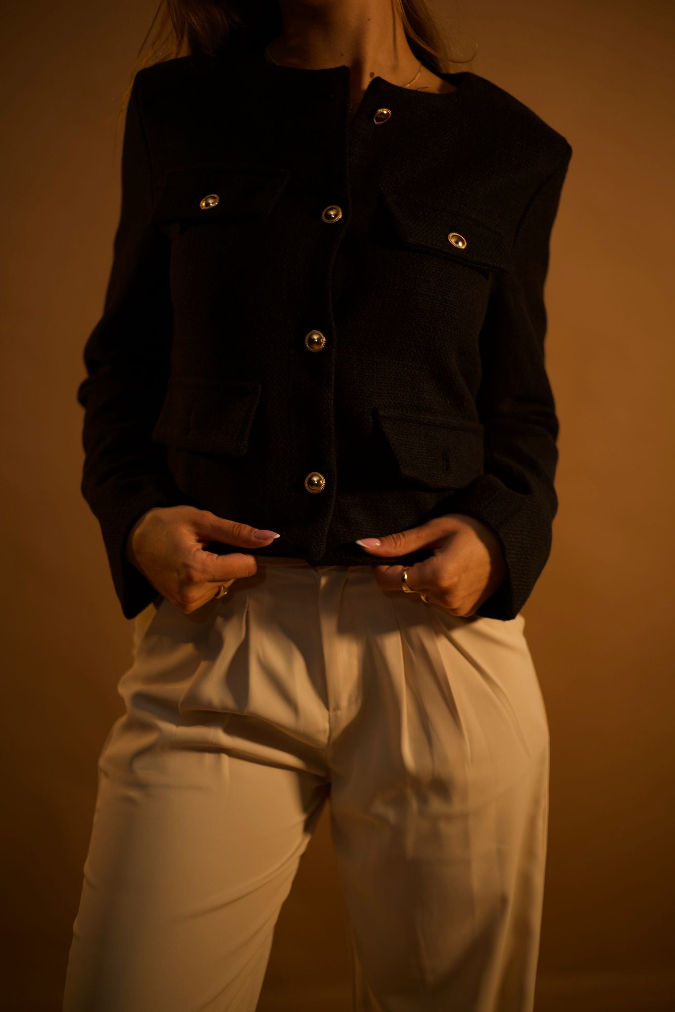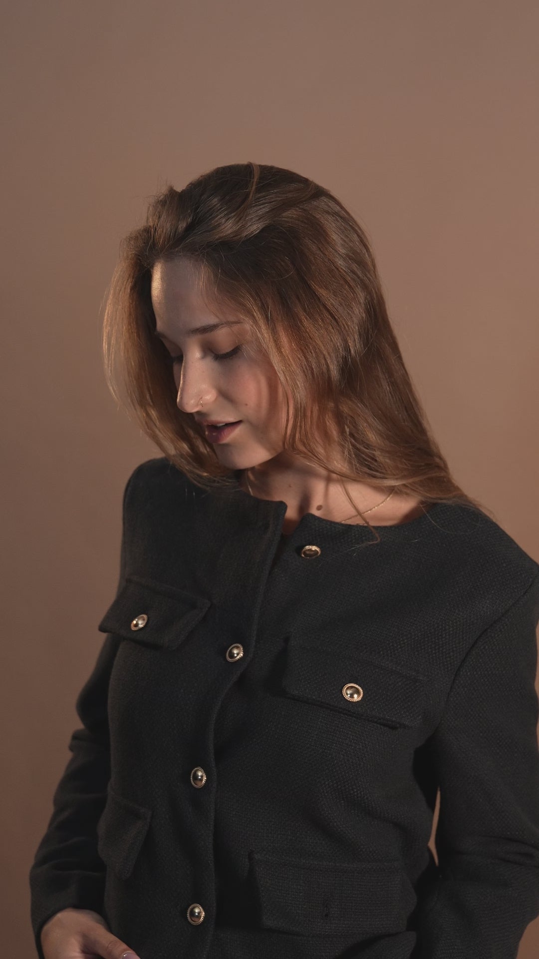 ג׳קט נשי קלאסי בהשראת בתי האופנה האירופיים, עשוי מבד טוויד איכותי בעל מרקם צפוף ונעים למגע.