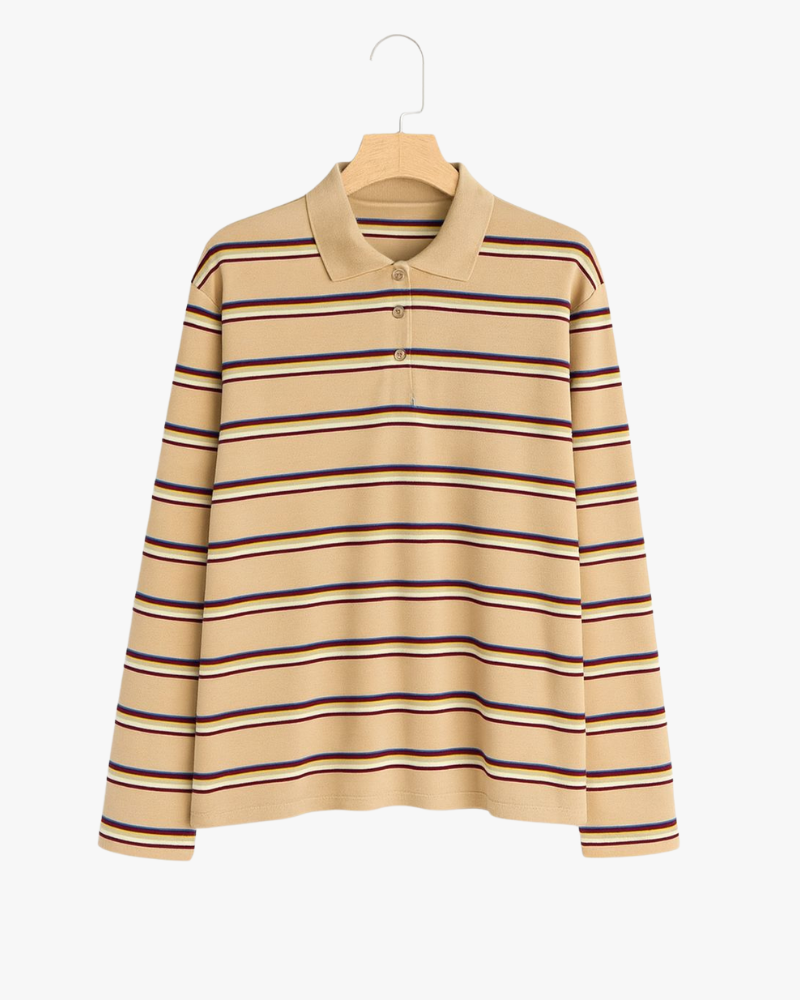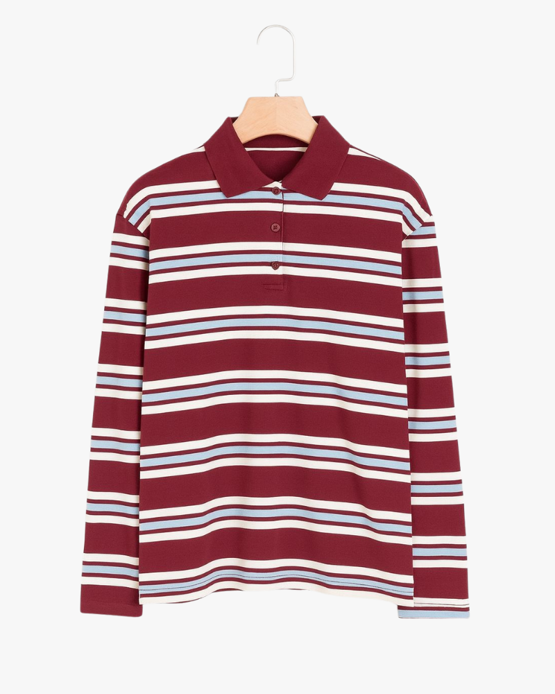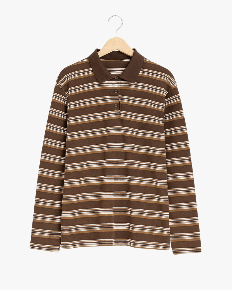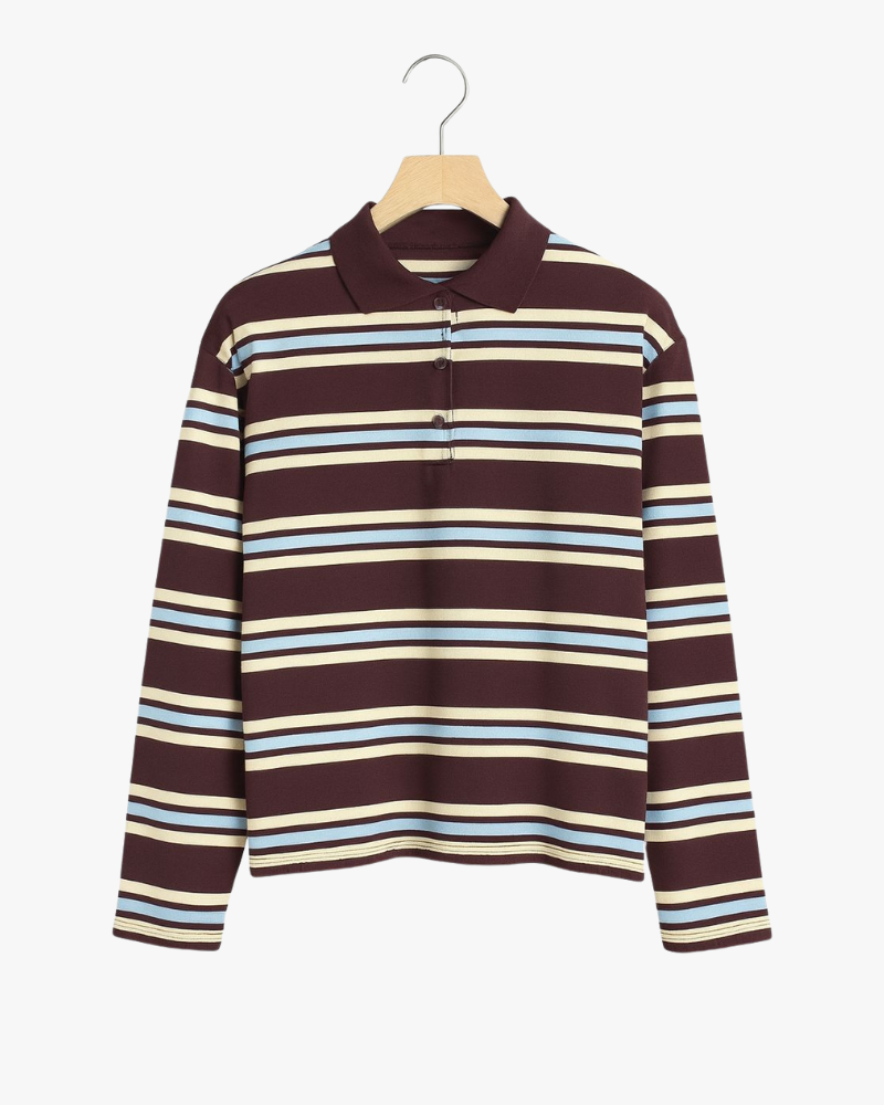 חולצת פולו ארוכת שרוולים בהשראת סגנון ה־Old Money, המעוצבת בגזרה נקייה ומדויקת. הפסים האופקיים בגוונים עמוקים יוצרים מראה עשיר אך רגוע, המתאים לכל עונה. עשויה מבד רך ונושם המרגיש נעים על הגוף ושומר על צורתו לאורך זמן.